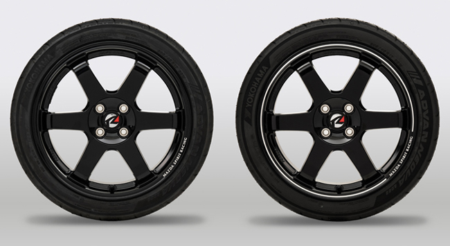 ▲足もとにはS耐シリーズの12号車でも採用しているTE37をベースに解析を行い、剛性を高めて形状を最適化するとともにバネ下重量の軽減を図った専用RAYS社製7J×17鍛造アルミホイール(ブラック塗装)を装着(写真・左)。MAZDA SPIRIT RACING ROADSTER 12Rには切削ライン&ブラック塗装を施す(同・右)