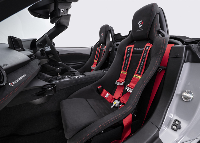 サーキットでのスポーツ走行に適した仕様を求めるユーザーに向けたアフターパーツ「MAZDA SPIRIT RACING SPORTS PACKAGE」を設定した点も見逃せない。具体的には、低回転から高回転での音色変化にこだわった藤壺技研工業製チタン製スポーツマフラーや、横浜ゴム製のスポーツタイヤ「ADVAN NEOVA AD09」、ブレンボ社製のブレーキセット(スリットロータ&スポーツパッド)、オーエス技研製のLSD&専用オイル、“Sabelt”דMAZDA SPIRIT RACING”ダブルブランドハーネス(4点式/6点式)などを設定している。