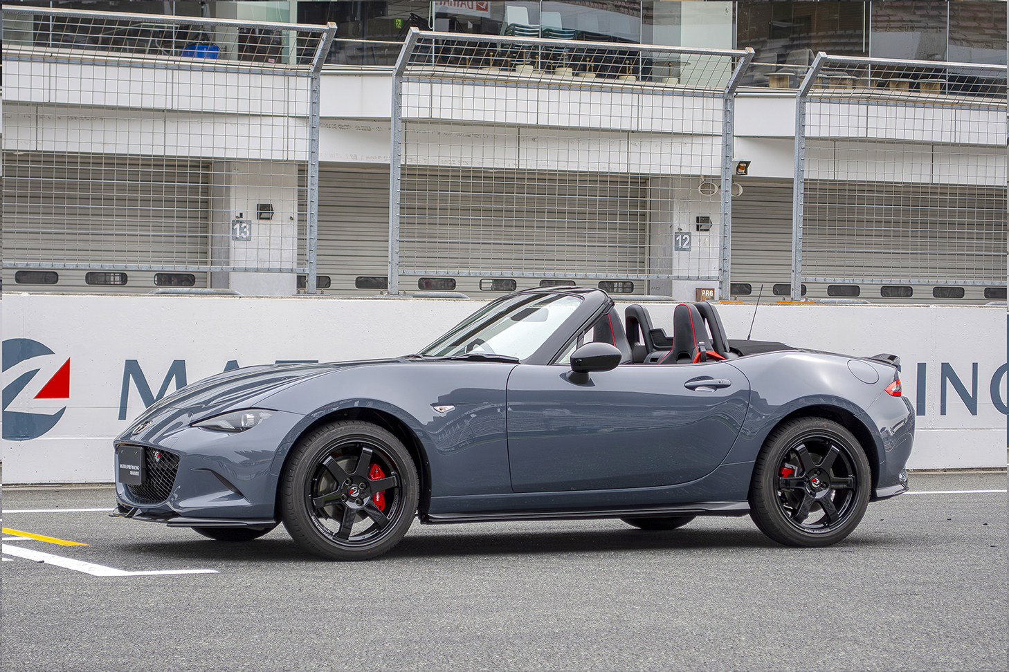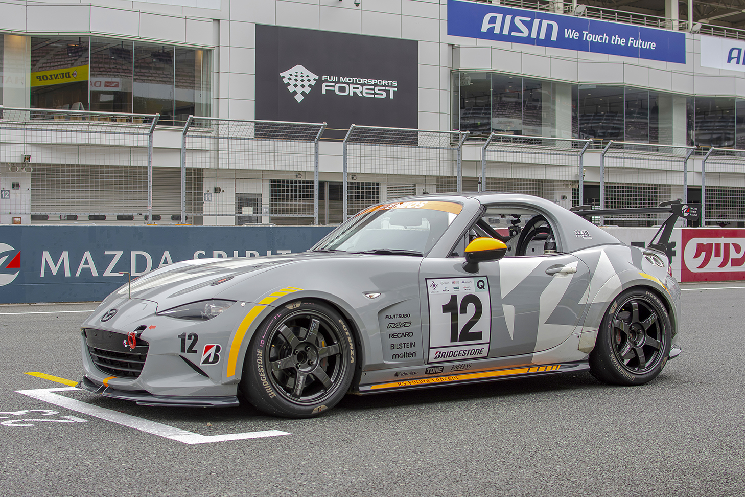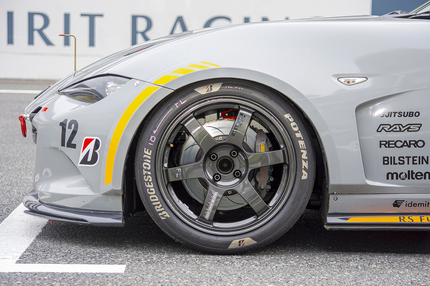 ディテールをみていこう。ST-Qクラス参戦車「12号車」は、見た目こそロードスターそのものだが、足回りは完全に「プロトタイプ」。RAYSと共同開発した専用鍛造ホイール、Brembo製ブレーキ、エンドレス製ブレーキパッドなどが組み合わされ、市販モデル12Rの開発母体として、精度と耐久性を極限まで突き詰めている。