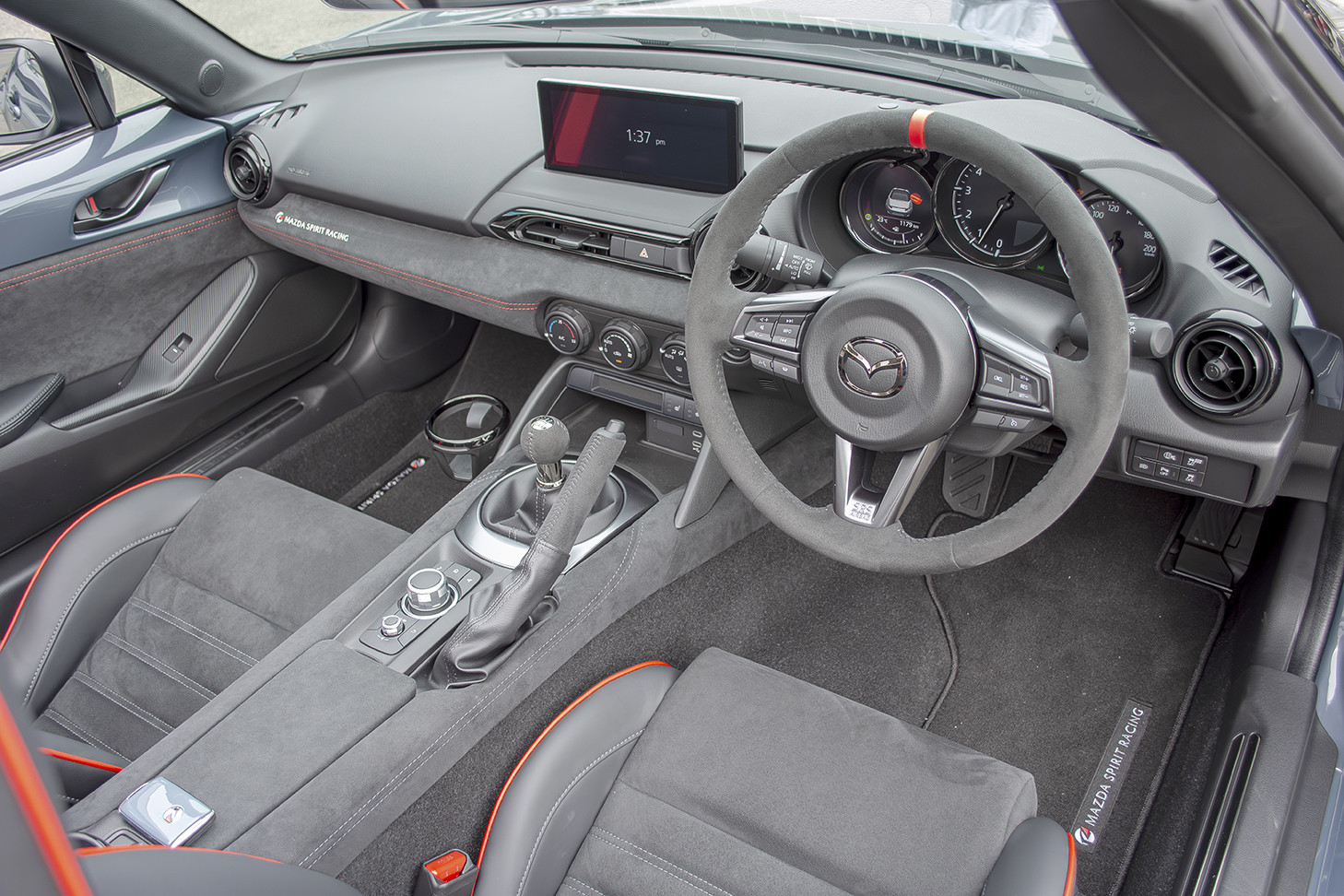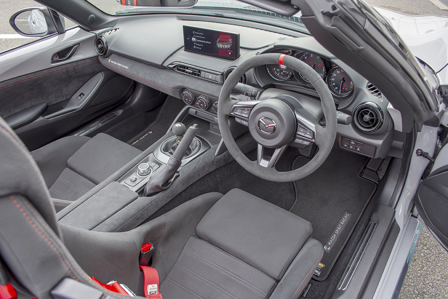 ▲レーシングカー12号車のコックピット。ステアリングはレーシンググローブの着用時に抜群のグリップを約束するスウェードタイプを採用。助手席ダッシュボードのMAZDA SPIRIT RACINGのロゴも市販モデルと対となるデザイン
