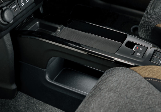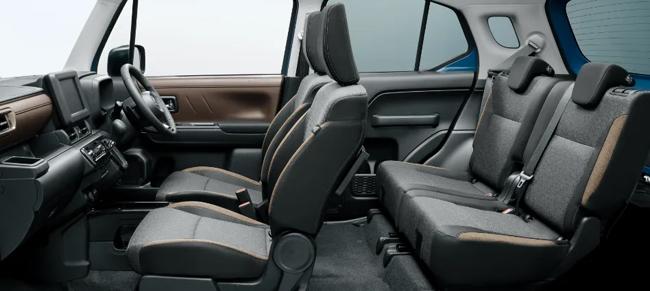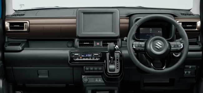 インテリアについては、インパネやドアトリムを全面刷新し、SUVらしい力強さと上質さを表現しつつ、フロントドアトリムとインパネをつなげて、室内が広く見えるデザインとする。インパネカラーパネルとドアトリムカラーパネルは、シックなダークブラウンで仕立てた。また、スズキの国内初となる7インチメーターディスプレイ[カラー]や、ステアリングスイッチ(オーディオ/マルチインフォメーションディスプレイ)を標準装備。上級グレードのHYBRID MZにはType-CおよびPD対応のUSB電源ソケット(インパネ、2個)や、スイッチひとつで簡単に操作できる電動パーキングブレーキ(ブレーキホールド付)、マニュアルモード付パドルシフト、ステアリングヒーター、上下2段トレーのセンターコンソール、パーソナルテーブルなどを標準で組み込む。9インチHDディスプレイおよび全方位モニター付メモリーナビゲーションはオプションで設定した。