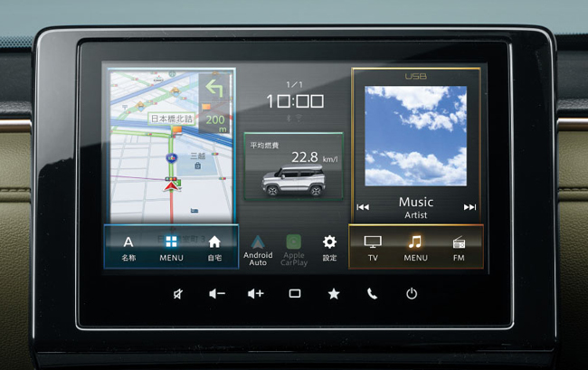 まずエクステリアは、たくましさを感じさせる角を丸めた四角をモチーフとし、ユニークで愛着のわくスタイリングに進化。フロントグリルの造形を変更するとともにメッキを廃止し、ホットスタンプを採用することで汚染物質の排出を防止したこともトピックだ。また、ハイブリッドMZに装着するアルミホイールは、クロスビーのXをモチーフにタフさを感じさせる新造形に変更する。ボディカラーは遊び心と力強さを兼ね備えた新色のミスティックブルーメタリックを追加したほか、ルーフ・サイドカラーパネル・バンパーガーニッシュをブラックに統一した新タイプのブラックタフ2トーン(ミスティックブルーメタリック ブラックタフ2トーン/ピュアホワイトパール ブラックタフ2トーン/バーニングレッドパールメタリック ブラックタフ2トーン/キャラバンアイボリーパールメタリック ブラックタフ2トーン)、ホワイトルーフ2トーン(ミスティックブルーメタリック ホワイト2トーンルーフ/キャラバンアイボリーパールメタリック ホワイト2トーンルーフ/タフカーキパールメタリック ホワイト2トーンルーフ)、ガンメタリックルーフ2トーン(クールイエローメタリック ガンメタリック2トーンルーフ)、ブラックルーフ2トーン(フロンティアブルーパールメタリック ブラック2トーンルーフ)、モノトーン(ピュアホワイトパール/スーパーブラックパール/メロウディープレッドパール/タフカーキパールメタリック)という全13通りのカラーをラインアップした。