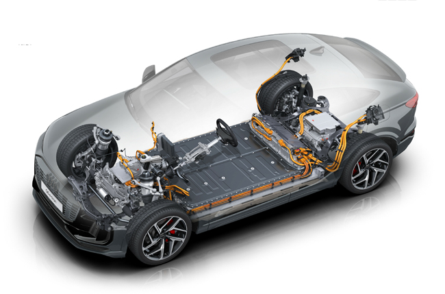 ▲Q6スポーツバックe-tronクワトロはパワートレインにシステム最高出力285kW、最大トルク前275Nm/後580Nmを発生する前後モーターと、総電力量100kWhのリチウムイオンバッテリーを搭載。0→100km/h加速は5.9秒を実現