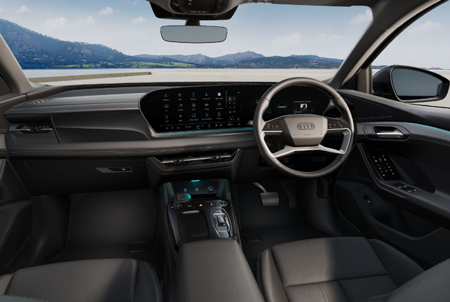 ▲スリムな独立型アウディMMIパノラマディスプレイは曲面デザインとOLEDテクノロジーを特徴とし、11.9インチのアウディバーチャルコックピットと14.5インチのMMIタッチディスプレイで形成。運転席エリアは曲線を基調にしてデザインし、ディスプレイがドライバー側に向けて緩やかにカーブする。写真はQ6スポーツバックe-tronのインテリアで、日本導入モデルのハンドル位置は右