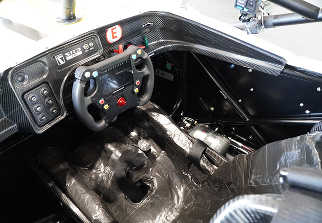 4周の試乗がスタート。スタート時のみクラッチペダル操作を行いまずは造作なく発進。スペースフレーム構造シャシーにボディは複合材プラスチックとカーボンの組合わせ。車重は620kg。非常に軽い。試乗車のエンジンはスズキ隼がベースの1.5リッター・4気筒。ラディカルがチューンして232hpを発生し、ギアボックスはバイク流の6速シーケンシャルミッションと組む。変速はステアリング左右のパドルで操作。右アップ、左ダウンの世界標準だ。