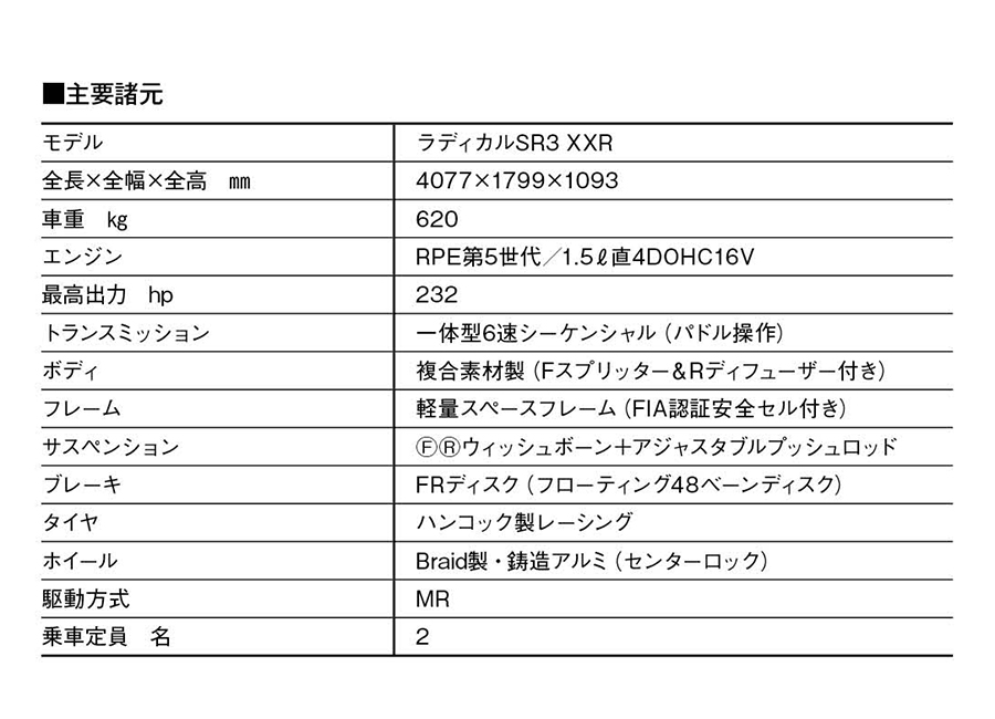 ラディカルジャパンはSR1 XXR/SR3 XXR/SR10 XXRなどを投入予定。1.5リッター(232hp)ユニットを搭載したSR3 XXRが主力モデル。2026年にはSR3 XXRによる「ラディカル・カップ・ジャパン」も開催予定。鮮烈なパフォーマンスはリアルマシンならでは。価格は約2200万円
