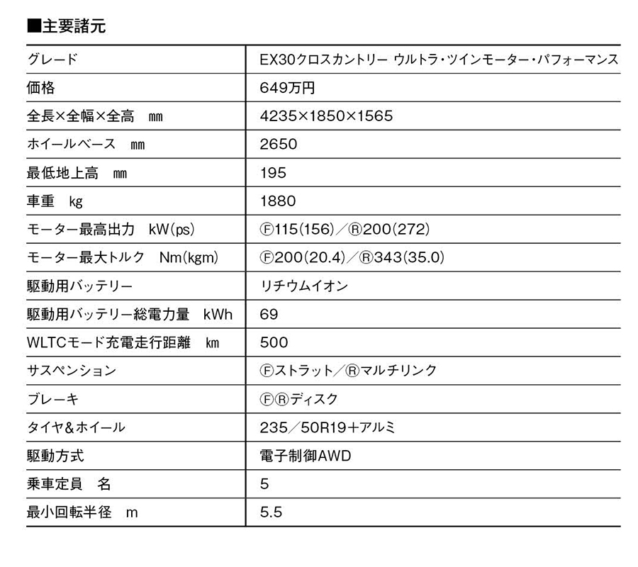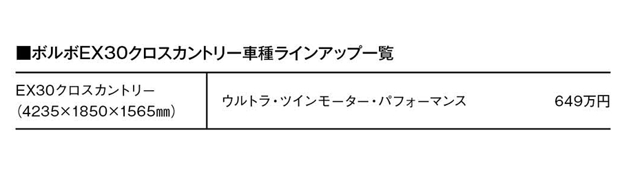 スタイリッシュな造形と、パワフルなモーター、そして快適性が融合したEX30クロスカントリーの商品性はすこぶる高い。定評の安全性能も、もちろん最高水準。BEVだから、豊かな自然環境に踏み込む場合でも、排出ガスの心配が不要なのもプラスポイントである。新たなクルマ選びに最適の選択肢といえる。