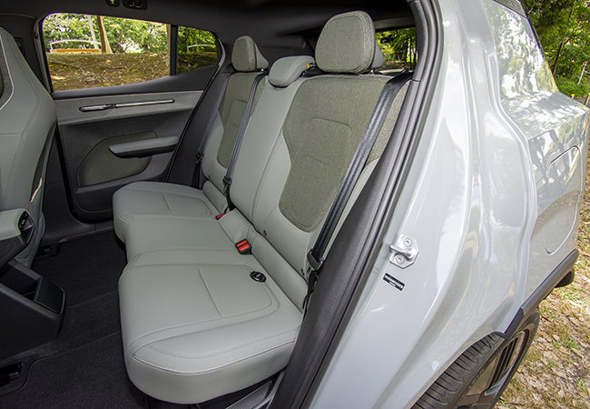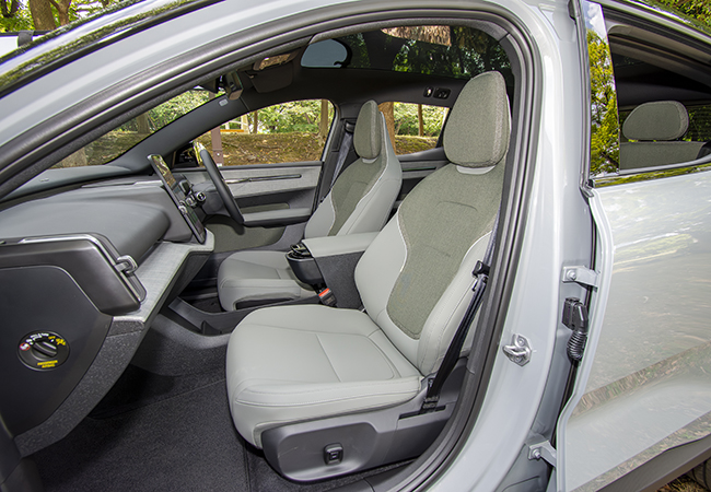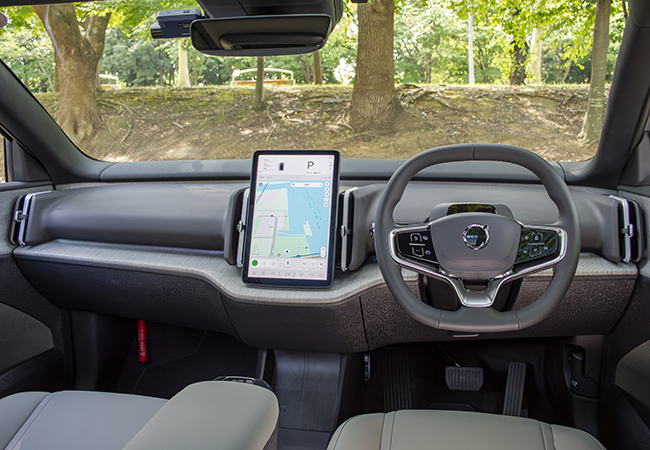 室内はボルボらしく居心地がいい。内装はスカンジナビアの常緑松林をイメージした“パイン”仕様。明るさと落ち着きを巧みにバランスさせた色調でまとめている。前席は大型形状。初期型EX30と比較してクッション長が拡大され、一段と座り心地が向上していた。