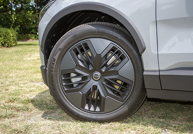 EX30クロスカントリーは、ボルボの故郷、スウェーデンならでは豊かな自然が育んだ電動車である。評価の高いEX30をベースに仕立てられ、モーターを前後ツイン化することで4WDを実現。さらに専用サスペンションなど各部を強化している。オフロードでの走破性を図る尺度となる最低地上高は195㎜と十分なレベル。エクステリアはマットグラファイト仕上げの19㌅アルミや、ダークカラーで統一した前後パネル、ブラックルーフが精悍な印象を強調する。ディーラーopで、18㌅のオールテレインタイヤと専用アルミ、ルーフバスケットなどをセットした“アウトドア仕様”が選べるのも魅力的だ。