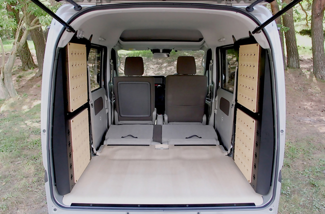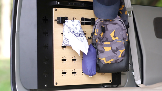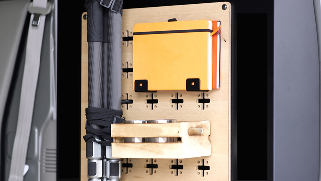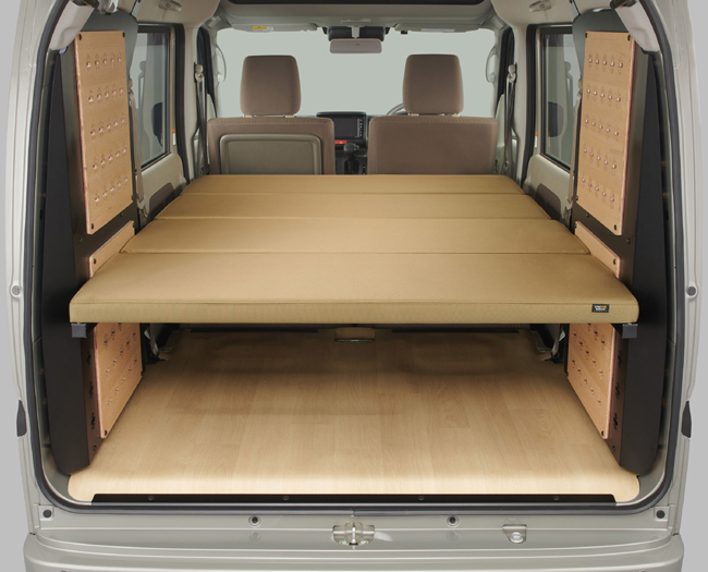 また、オプションとして耐水性および撥水性に優れたCORDURA製の生地を採用し、脱着や装着位置の高さが4段階調整できるベッドマット(22万円高)を用意。1枚当たりのマットの厚さは50mmを確保し、4枚装着時のベッド寸法は長1800×幅1170mmを実現して車中泊に対応する。マットを高めに設置した際は、下部に荷物を置くことも可能だ。マットのカラーは有孔ボードなどと同様、ナチュラルベージュとブラックを設定している。