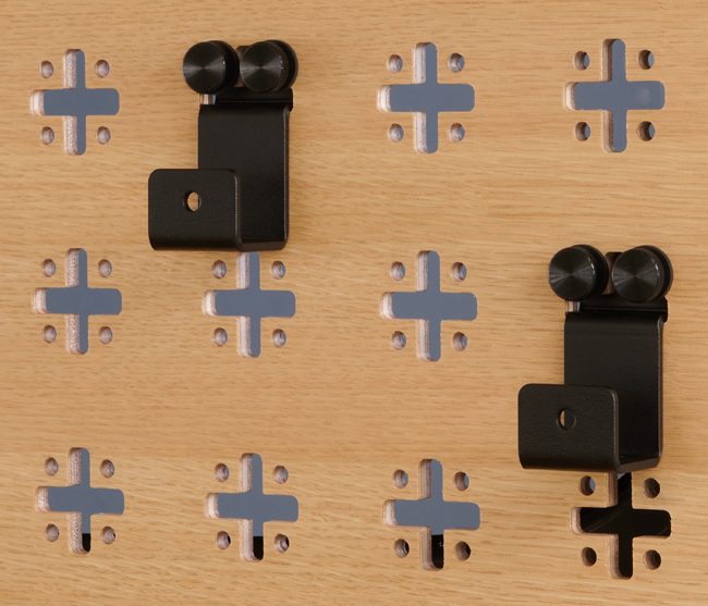 注目の荷室は、スチールラックと有孔ボード、それらに装着できるJ型およびL型の2種類の専用ブラケット、そして防汚性のある専用フロアを装備する。ラックやボードはオリジナルの有孔デザインとし、専用ブラケットの取付け位置や向きを柔軟に調整することが可能。また、市販品の汎用フックなども取付け可能で、趣味やレジャーのほか配達や移動販売など、幅広い用途に合わせて荷室をアレンジすることができる。有孔ボードおよび専用フロアのカラーは、ナチュラルベージュのほかブラックも選択可能だ。