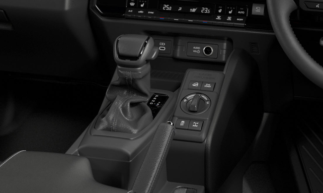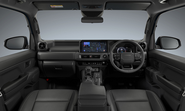 インテリアについては、移動の楽しさを体験できるキャビン空間を目指し、車両姿勢が認知しやすい水平基調のインストルメントパネルや、視点移動が少なくなるよう機能をそれぞれ集約したモニターおよびスイッチ類、自然な操作ができるシフトノブなど、様々な環境で運転する時でも瞬時に認知・操舵ができるコクピットレイアウトに仕立てる。必要な情報を見やすく集約したマルチインフォメーションメーターディスプレイは、速度やナビゲーション、車両状態など、運転に必要な情報を効率的に表示。オフロード走行時には、ピッチ角やロール角、方位などの情報も表示可能で、安全な走行を支援する。このメーターディスプレイと上面が連なる形で、スマートフォンとの連携も可能なタッチパネル式のHDディスプレイオーディオを配備した。また、安全なオフ/オンロード走行に貢献するため、低く設計されたカウルとインストルメントパネル上面によって、見通しのいい前方視界を確保。悪路でも路面を見下ろしやすいように、ベルトラインは低く設計した。さらに、プリクラッシュセーフティなどの先進機能を付与した最新の予防安全パッケージ「トヨタセーフティセンス」を採用し、より安心な運転をサポート。リアビューカメラは余計な突起を無くし、かつデザイン性も配慮してスペアタイヤの中央部に配置した。一方、シートレイアウトは2/3名乗車の2列式で構成。前後席ともに広い横方向のスペースとヘッドクリアランス、足もと空間を実現している。