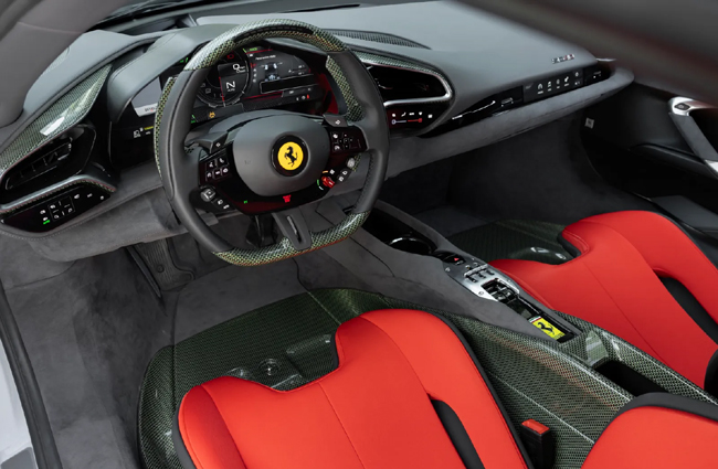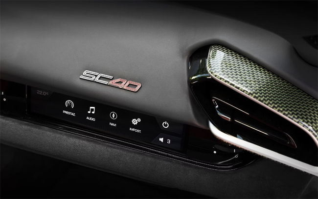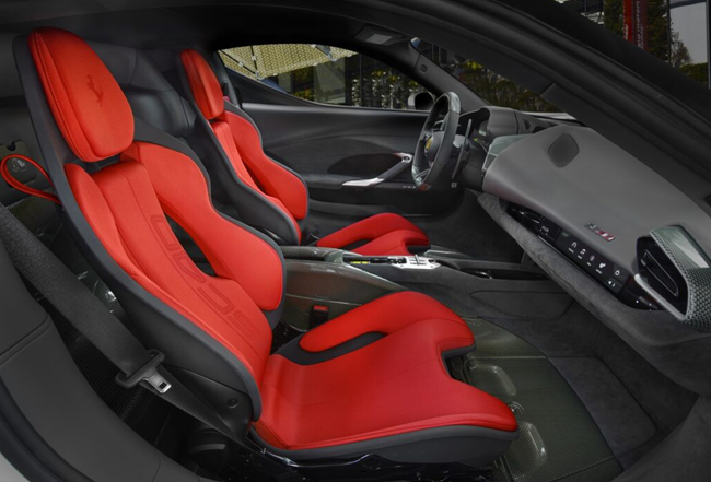 インテリアについては、296GTBのデジタルインターフェースを踏襲しつつ、F40を想起させるケブラー素材を再開発して足元やシート背面、ステアリングホイール、ダッシュボードインサートの一部、フロアマットの一部などに採用したことが訴求点。同素材はエンジンベイやラゲッジコンパートメントにも使用する。ダッシュボードにはSC40バッジを貼付した。一方、バケットタイプのシートにはチャコールのアルカンターラとレッドのジャカードテクニカルファブリックのコンビネーション表皮を張り、ヘッドレストには跳ね馬ロゴを、シートバックにはSC40ロゴを配備している。