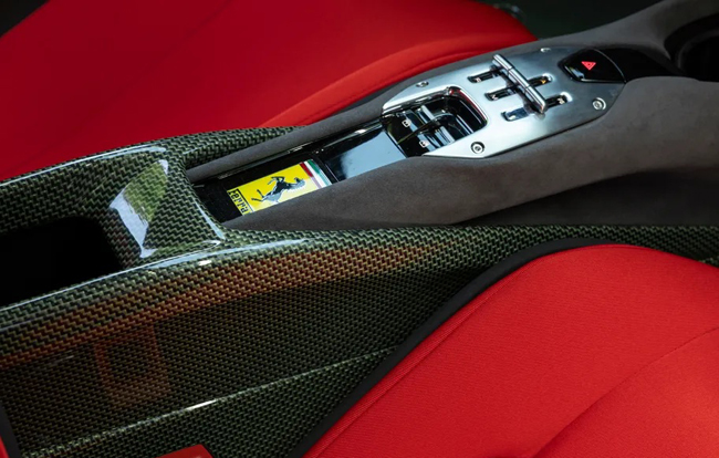 ▲インテリアは296GTBのデジタルインターフェースを踏襲しつつ、F40を想起させるケブラー素材を再開発して足元やシート背面、ステアリングホイール、ダッシュボードインサートの一部、フロアマットの一部などに採用する
