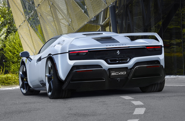▲フェラーリSC40 全長4700×全幅1975×全高1198mm ホイールベース2600mm 車重1550kg 乗車定員2名 ボディカラーには太陽の光の下でボディの曲線を強調するクールな色合いの特注色“SC40ホワイト”を纏う