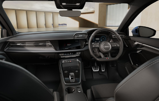 ▲写真はセダン40TFSIクワトロ アドバンストのインテリア。ボルケーノグレーのデコラクティブパネルやパドルシフト付き3スポークレザーマルチファンクションステアリングホイールなどを標準装備。日本導入モデルのハンドル位置は右
