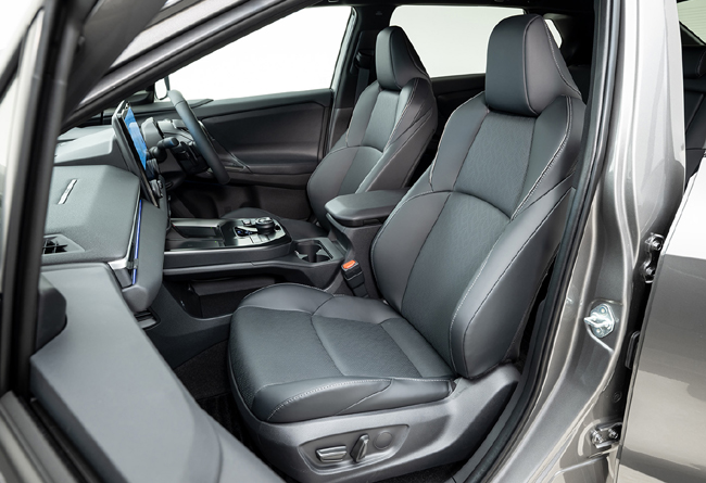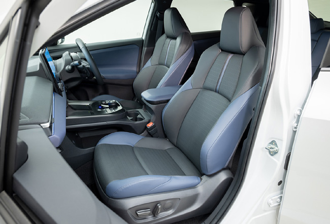 インテリアについては、インパネ全体でシンプルな横基調の造形を施し、居心地の良さを感じさせる開放的なキャビン空間を創出。また、上級グレードのET-HSの本革シートには、ブルーを基調としたナッパレザーを採用する。さらに、14インチの大型ディスプレイを採用して車両情報やハードスイッチをディスプレイ内に集約することで、よりシンプルで使いやすいコクピットに仕上げた。