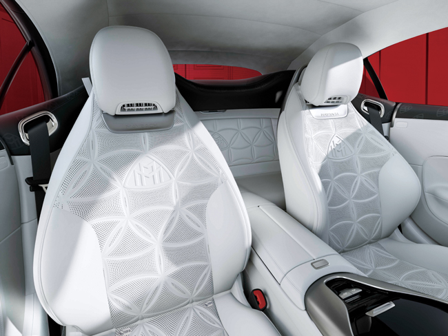 内包するインテリアは、マイバッハ特有の装備と、ドアパネル、センターコンソール、そしてブランドのロゴをあしらったシートにクリスタルホワイトのナッパレザーを採用したことが訴求点。植物由来のなめし加工を施したクリスタルホワイトカラーのナッパレザーは、なめし剤にコーヒー豆の殻を原料とするサステナブル素材を使用する。シート自体は花びらを思わせる新たなフローラルデザインを導入し、シート後方のスペースにもフローラルデザインのホワイトレザーを張る。また、メッキ装飾を施したシートバックレストとシルバークロームのトリムによって、鮮やかなコントラストを演出した。さらに、デジタルコックピットディスプレイとメディアディスプレイにはローズゴールドを基調とした専用の表示スタイルとスタートアップアニメーションを配備。そして、マイバッハロゴを本革巻きウッドステアリングやステンレスペダル、イルミネーテッドステップカバーなどにあしらって、ユーザーの所有欲を満たすようアレンジする。機能装備として、エナジャイジングエアコントロールやエナジャイジングパッケージプラス、ワイヤレスチャージング、17スピーカー/1220WのBurmesterハイエンド3Dサラウンドサウンドシステムなども標準で組み込んだ。