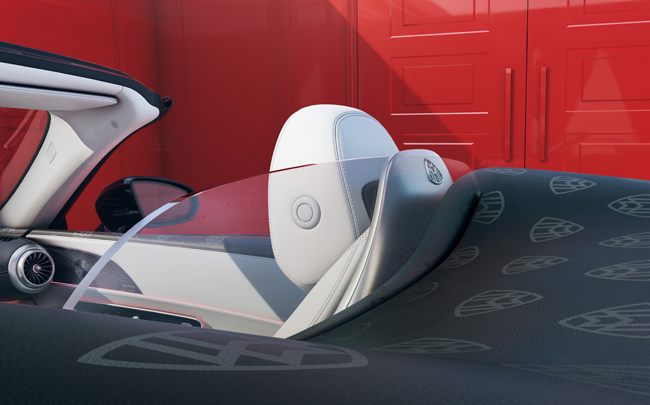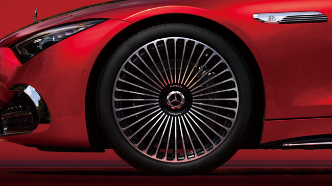 一方、ヘッドライトの内部はローズゴールドの上質なアクセントで仕上げ、またフロントスポイラー左右に配置したワイドなエアインテークには多数のマイバッハエンブレムを配備。さらに、フロントガラスフレームやサイドスカートにはクローム装飾を施す。リアセクションについては、マイバッハのロゴをあしらったリアコンビネーションランプやクロームトリム、ルーバーによって上下に二分割したエグゾーストエンド、ディフューザーを備えた専用デザインのリアエプロンなどを配して、エレガントかつ印象的な後ろ姿を創出。シート後方にはエアロダイナミクスを追求してデザインしたダブルスクープを配し、オープンモデルならではの個性的なスタイリングを強調した。足もとには5ホールデザインの21インチ鍛造アルミホイール(R76)を標準で、マルチスポークデザインの21インチ鍛造アルミホイール(R29)をオプションで採用。タイヤは前275/35/後305/30R21サイズを組み込んでいる。