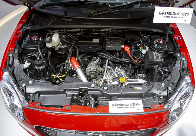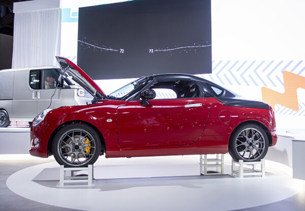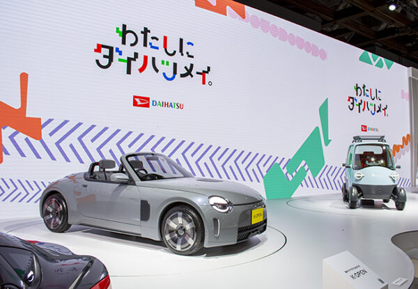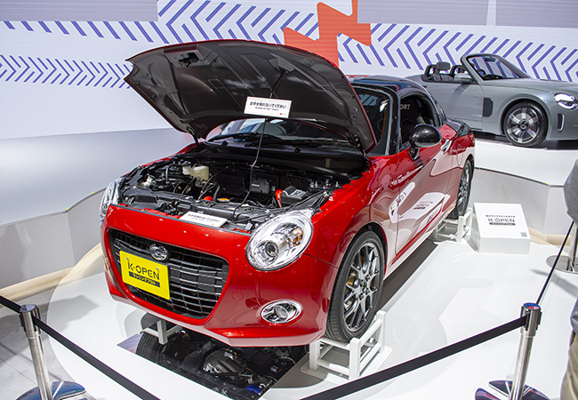 ダイハツ・ブースでひと際注目を集めていたK-OPENは、生産終了が伝えられた現行コペンの後継車として開発中のコンセプトモデル。1.3リッターの小型車だった2年前の出展車「VISIONコペン」をKカー規格に再構成した期待のコンパクトスポーツである。最大の注目点はFRレイアウトの採用。従来のFFから、よりスポーティな色彩を鮮明にし、オープンエアの爽快さとFRならではの小気味いい走りの融合を目指している。今回、デザインプロトとともに、「作ってみる、乗ってみる、試してみる」の精神で製作された先行スタディ車(現行コペン・ベース)を展示し、その本気度をアピールした。