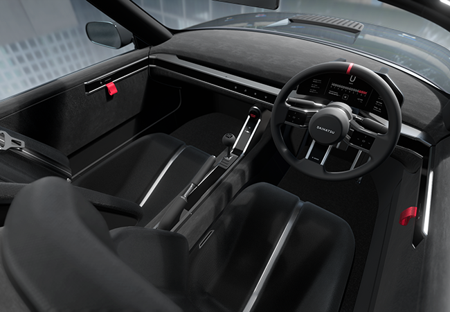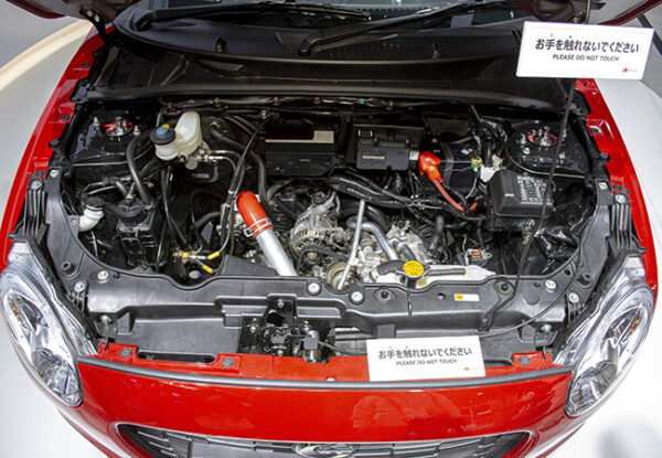 先行スタディ車はエンジンを助手席側に傾け、前後だけでなく左右の重量配分も適正化。リアデフやドライブシャフトなど各コンポーネンツはK商用車のハイゼットからの流用という。商用車とはいえ、ダイハツはすでにFRに長い経験を持つメーカーなのだ。