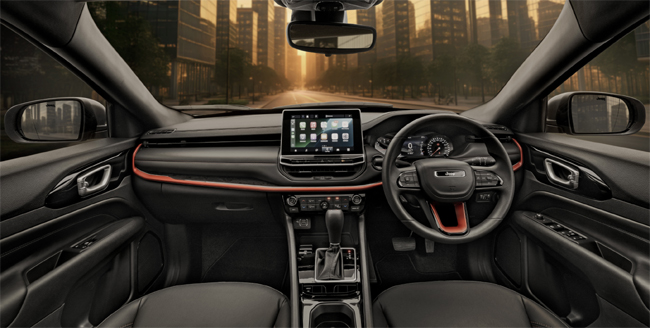 まず外装では、既存のクロームアクセントの部位にニュートラルグレーとグロスブラックを採用したことがトピック。具体的には、ニュートラルグレーアクセント付グロスブラックフロントグリルやニュートラルグレーアクセントを配したサイドおよびリア、ニュートラルグレーウィンドウモールディング、ニュートラルグレーアクセント付ブラックルーフレール、ニュートラルグレードアミラー、ニュートラルグレーJeepバッジ、グロスブラックフォグランプベゼル、グロスブラック18インチアルミホイール(タイヤは225/55R18 3シーズンタイヤ)などを特別装備する。また、フロント下部フェイシアアプリークにはレッドカラーのアクセントを施し、さらにブラック/ニュートラルグレー/レッド配色のCompassバッジと、カモフラージュ柄にレッドの“TRAIL”ロゴを入れた専用バッジを貼付して、本特別仕様車ならではの個性を際立たせた。