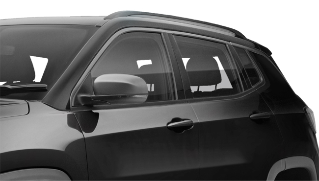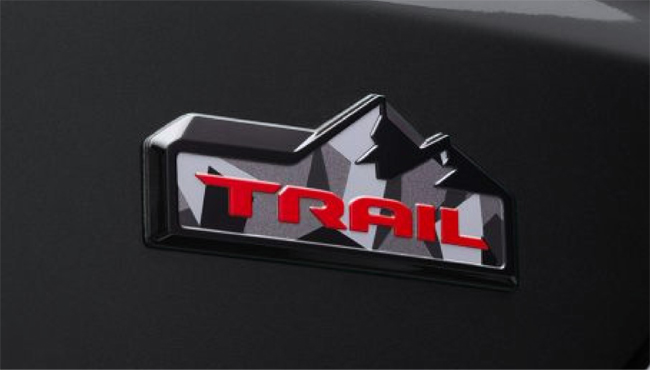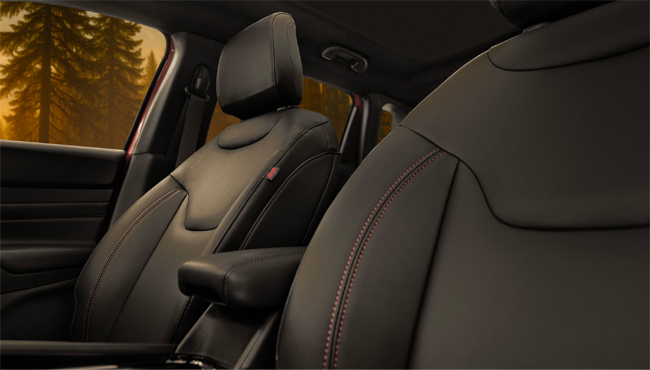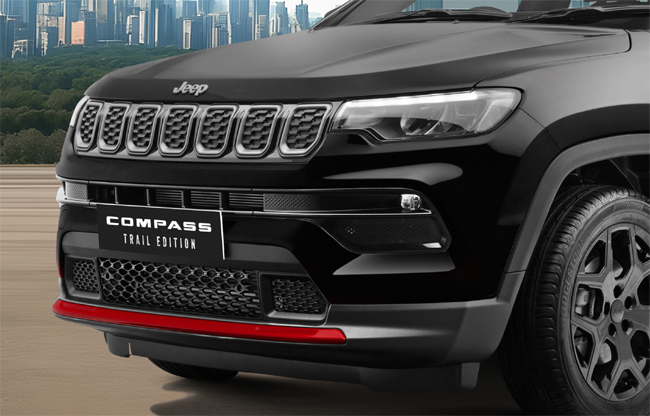 まず外装では、既存のクロームアクセントの部位にニュートラルグレーとグロスブラックを採用したことがトピック。具体的には、ニュートラルグレーアクセント付グロスブラックフロントグリルやニュートラルグレーアクセントを配したサイドおよびリア、ニュートラルグレーウィンドウモールディング、ニュートラルグレーアクセント付ブラックルーフレール、ニュートラルグレードアミラー、ニュートラルグレーJeepバッジ、グロスブラックフォグランプベゼル、グロスブラック18インチアルミホイール(タイヤは225/55R18 3シーズンタイヤ)などを特別装備する。また、フロント下部フェイシアアプリークにはレッドカラーのアクセントを施し、さらにブラック/ニュートラルグレー/レッド配色のCompassバッジと、カモフラージュ柄にレッドの“TRAIL”ロゴを入れた専用バッジを貼付して、本特別仕様車ならではの個性を際立たせた。