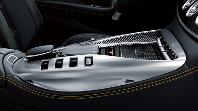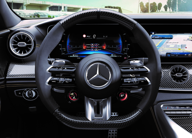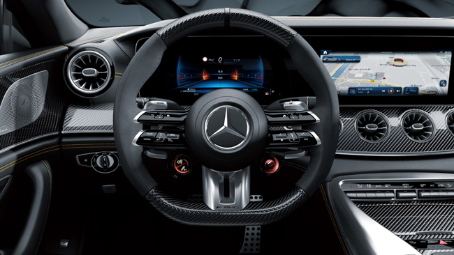 ▲AMGパフォーマンスステアリング(カーボンファイバー/MICROCUT)やナッパレザー/MICROCUTのフルレザー仕様(ブラック、イエローステッチ入)、AMGカーボンインテリアトリムを標準装備。ハンドル位置は左