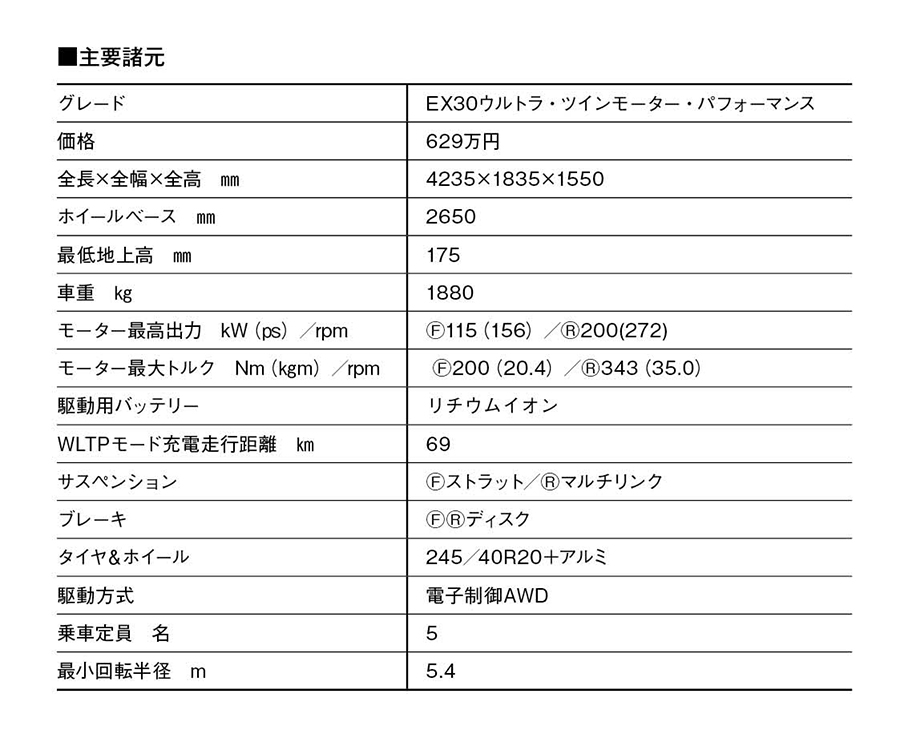 ボルボEX30ウルトラ・ツインモーター・パフォーマンス/価格:629万円。コンパクトBEVのEX30はエントリーモデルのプラス・シングルモーター(479万円)、SUVテイストのクロスカントリー(649万円)など全5グレード構成に成長。ウルトラ・ツインモーター・パフォーマンスは156psと272psのモーターを前後に搭載した4WD。ボルボ史上最速の0→100km/h加速3.6秒を誇る