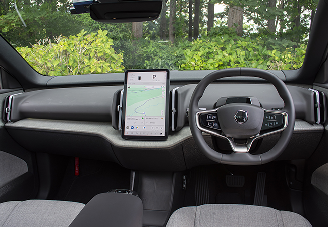 対面したEX30は、路面を鷲掴みにする大径タイヤとワイドトレッドが印象的なものの、ハイパフォーマンスモデル特有の威圧感は皆無。ボルボらしくモダンながら、控えめな印象を伝える。古風なクルマ親父にとっては、やや拍子抜けだ。