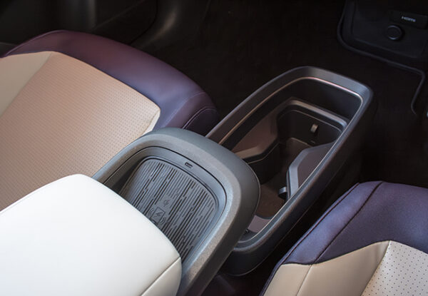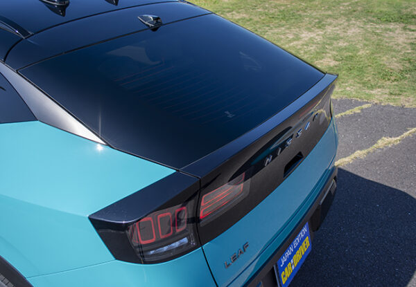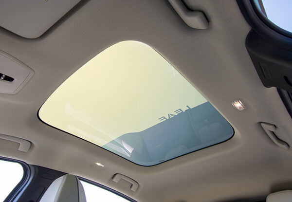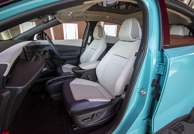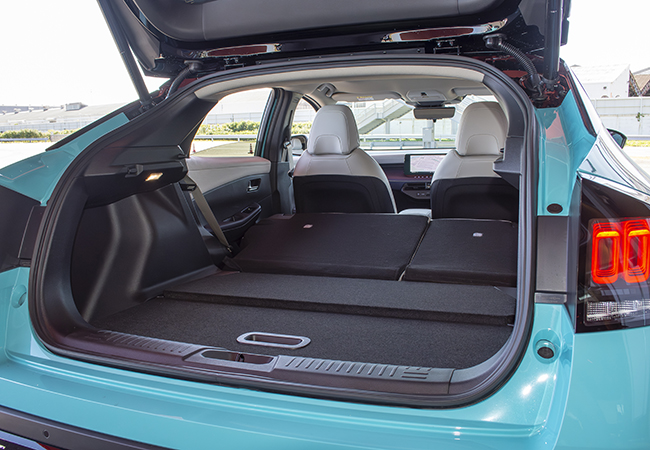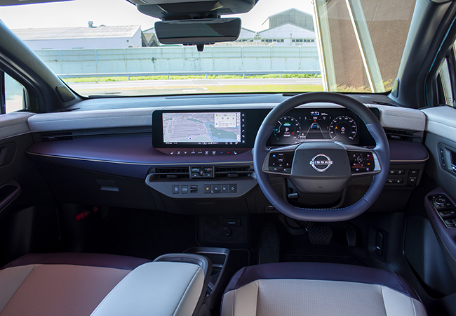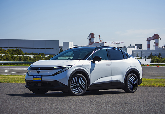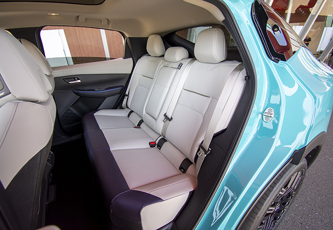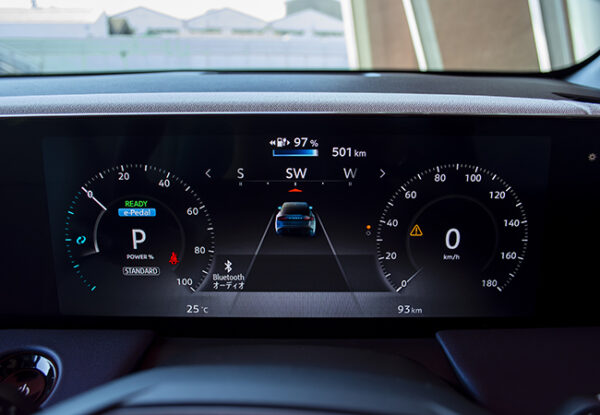 新型は基本骨格から刷新された。これまで使っていたBプラットフォームは内燃エンジン車にも用いられていたが、アリアと共通のBEV専用CMF-EVプラットフォームに変更。これにより車内の居住性は大幅に向上しており、これまで車内にあった空調ユニットをボンネット下のモータールームに移設したことで、前席の足元が広々とした。さらに、プッシュボタン式シフターの採用により容易にウォークスルーできるようにもなっている。後席のセンタートンネルがなくなりフラットになったのも朗報である。頭上には、電子制御によりガラスの透明度を変えられるようにした調光パノラミックガラスルーフを設定。新型の室内は広いだけでなく気持ちのいい開放感がある。