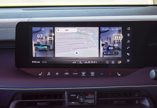 インパネも先進的である。横方向にワイドなフローティング形状を基調に、12.3インチと14.3インチのスクリーンを統合。メーターの背景デザインには、 日本家屋に見られる「縁側」を含めた5種類が用意され、64色から選べるアンビエント照明も楽しめる。Googleビルトイン機能を搭載した最新のインフォテイメントシステムも、大きなポイントのひとつ。これについては公道で試乗した際に詳しくレポートしたい。