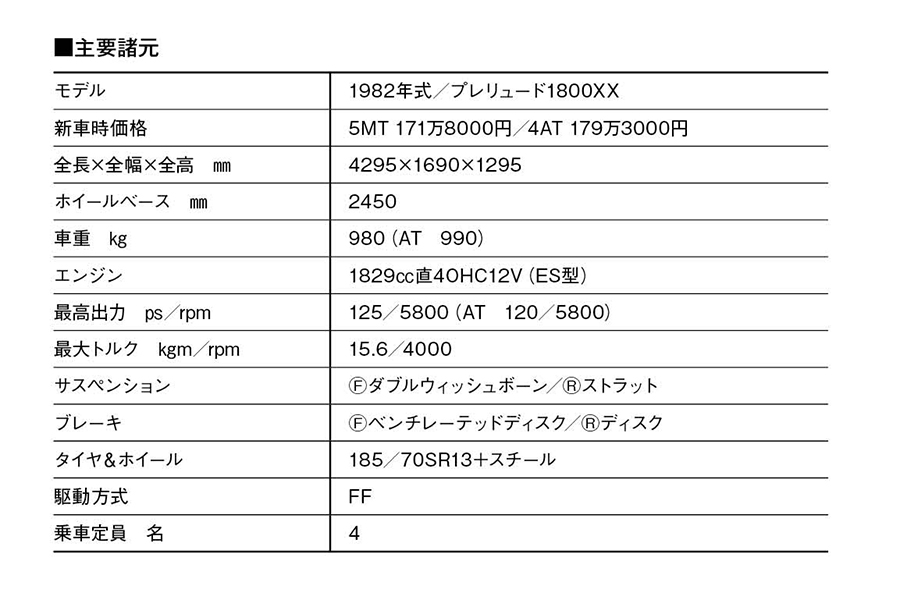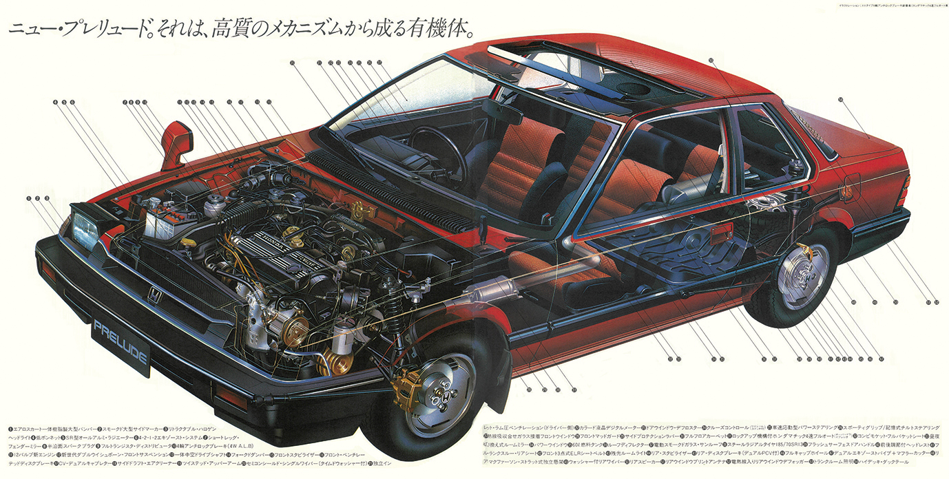 2代目プレリュードは「FFスーパーボルテージ」を掲げて登場。端正なクーペフォルムと圧倒的に低いリトラクタブル式ライトを備えたノーズライン、そして充実した快適装備が評価され大ヒット。「デートカー」という新ジャンルを構築した。初期型のパワーユニットは1.8リッターのデュアルキャブ仕様。ラインアップはXX/XZ/XCの3グレード構成だった