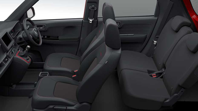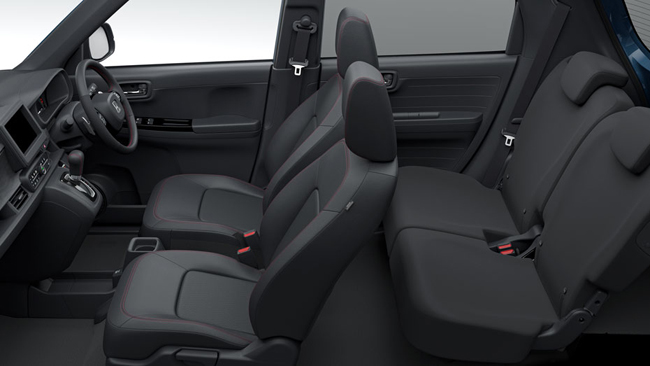 6速MT専用グレードとなったRSについては、スポーティな個性をより際立たせたことが訴求点だ。外装ではホワイトカラーの15インチアルミホイールを装着。一方で内装にはカーボン調のインパネガーニッシュや、RS専用表示のタコメーター/シフトインジケーター/Gメーターを組み込む7インチTFT液晶メーターを配備する。さらに、フロントシートは耐久性と適度な通気性を持つウルトラスエード×プライムスムース表皮を張り、合わせてレッドカラーのステッチとRSロゴの刺繍を施した。