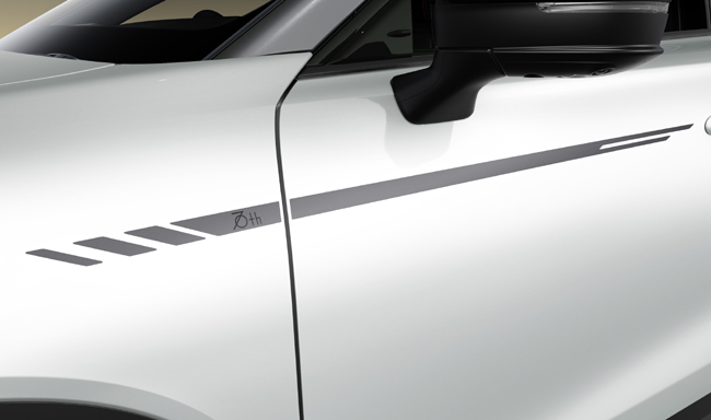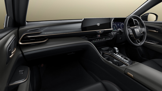 エクステリアについては、“世界に誇る日本のクラウン”を表現した専用の外装を纏う。ボディカラーは“日本の風景との調和”を表現したバイトーンのプレシャスメタル×プレシャスホワイトパールとプレシャスメタル×ブラックをオプションとして設定。ここにマットブラック塗装の8.5J×21アルミホイール(センターオーナメント付き。タイヤは235/45R21サイズ)やブラックのドアベルトモールディングを配備する。オプションとして、“THE 70th”ロゴをあしらった専用のサイドデカールも用意した。