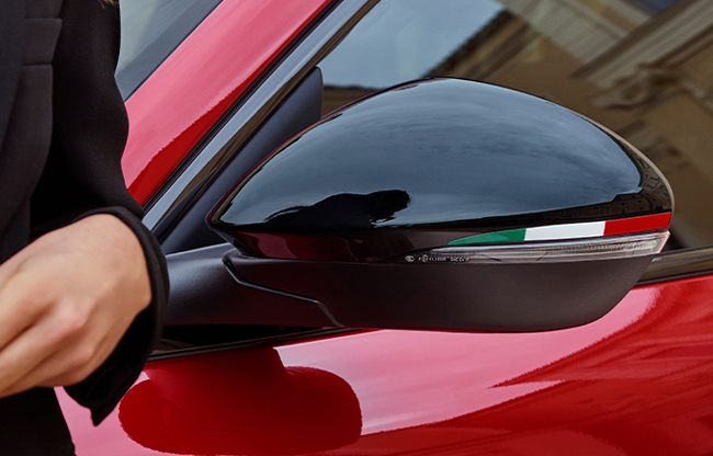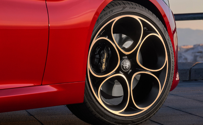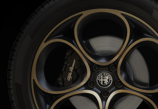 本限定モデルの最大の特徴は、Victory、Value、Exclusivity(勝利の歴史、ブランドの価値、そして特別な存在感)というアルファロメオの哲学を象徴するゴールドのアクセントを内外装の随所に配して、こだわりのクラフトマンシップを表現した点にある。まずエクステリアには、ゴールドダイヤモンドカット仕上げの5ホールブラックアルミホイール(ジュリアは19インチ、ステルヴィオは20インチ)、ゴールド“Alfa Romeo”ロゴ入りブラック仕上げブレーキキャリパー、イタリア三色旗バッジ付きのグロスブラックエクステリアミラーハウジングを特別装備して、ルックスの存在感をアップした。