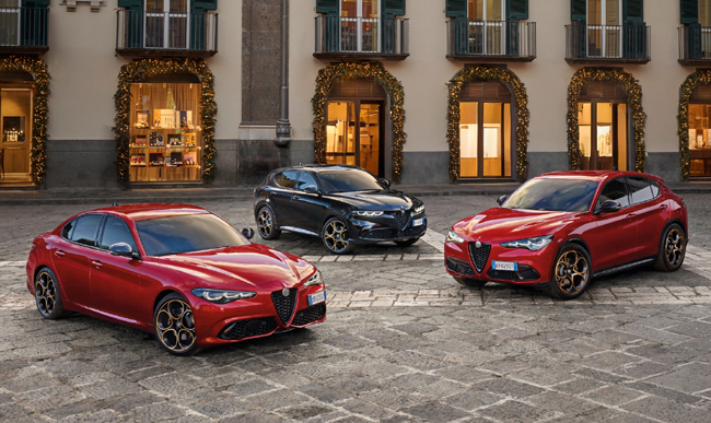 ▲“INTENSA”の車名を冠した特別仕様車はアルファロメオの情熱と美学を象徴する新設定の限定シリーズに位置。今回発売するジュリア インテンサ(写真・左)とステルヴィオ インテンサ(同・右)は本年9月に発売したトナーレ・ハイブリッド インテンサ(写真・中央)に続くシリーズの日本第2弾となる
