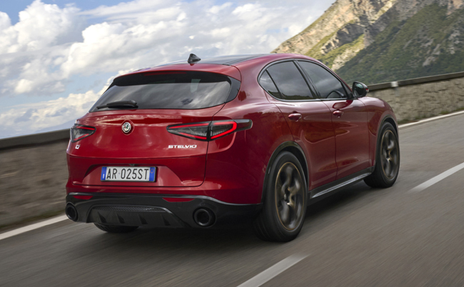 ▲アルファロメオ・ステルヴィオ インテンサ 価格:890万円 全長4690×全幅1905×全高1680mm ホイールベース2820mm 車重1810kg 乗車定員5名 WLTCモード燃費10.9km/リットル 販売台数はエトナレッド(写真)5台/モントリオールグリーン1台/ブルカノブラック6台の計12台限定