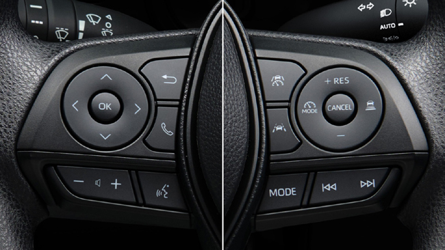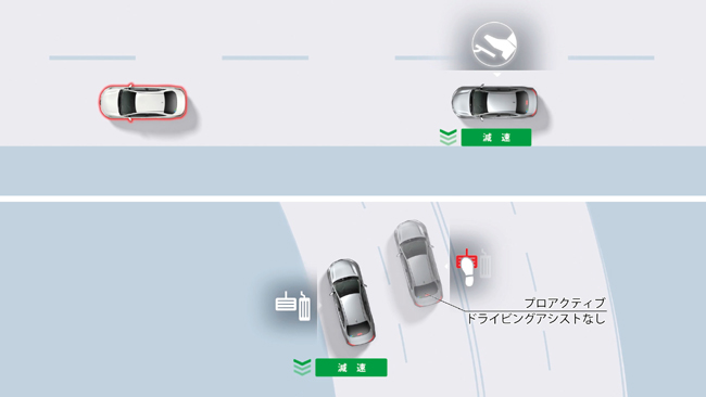 まずトヨタセーフティセンスでは、対応する事故形態をより拡大したことがトピック。プリクラッシュセーフティでは車両、歩行者、自転車運転者に自動二輪車(昼)を加えて検知範囲を拡張し、衝突回避または被害軽減を支援。事故割合が高い交差点での支援も拡大する。さらに、プロアクティブドライビングアシストを採用し、「歩行者の横断」「飛び出してくるかもしれない」など運転の状況に応じたリスクの先読みを行うことで、歩行者や自転車、駐車車両に近づきすぎないようにステアリング・ブレーキ操作をサポート。先行車や前方のカーブに対して減速操作をサポートし、頻繁な踏みかえ操作を軽減する機能も組み込んだ。ほかにも、アクセルの踏み間違いや踏みすぎなどで起こる衝突を緩和するパーキングサポートブレーキ(前後方静止物)を全車に標準で配備した。