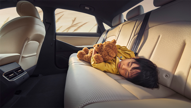 インテリアに関しては、包み込まれるような温かな空間を目指して設計。広範囲にソフト素材を配し、触感にこだわり抜いた独自開発のシート表皮、ゼロホルムアルデヒド認証を取得した内装素材を採用するなど、家族が安心してくつろげる快適なキャビン空間を形成する。また、前席には最新EVモデルのN7と同様に、AIにより乗員の体形に合わせてシートを調整する「ゼロプレッシャーシート」を採用。合わせて、後席には新開発の「ゼロプレッシャーソファ」を配備した。インテリアカラーはアイボリーとブラックの2種類を設定し、ローズゴールドやダークパープルの装飾が細部に高級感を添える。