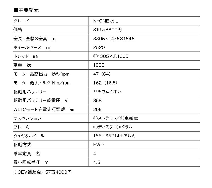 N-ONE e:のラインアップはシンプル装備のe:G(269万9400円)と、ナビなどを標準とした上級タイプのe:L(319万8800円)の2グレード構成。購入にあたって国のCEV補助金は57万4000円。東京都の場合、さらに40万円ほどの上積みが期待できる。車両価格そのものはKカーとしては高額だが、実質的には、通常のエンジン車と同等の負担で乗れる身近な電動車である。