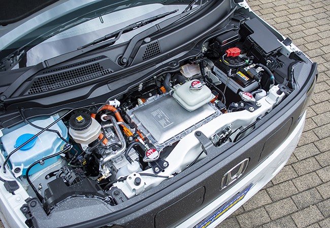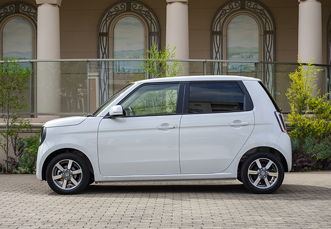 ボディサイズは、3395×1475×1545mm。最近のKカーはスペース性を重視した結果、車高が高いモデルが主流。そんな中にあってN-ONE e:は、数少ない立体駐車場対応モデルである。あえてN-BOXでなく、N-ONEをベース車に選んだのは、背が低いほうが空力に優れ航続距離が伸びる利点があることと、どんなシーンでも便利という点にこだわった結果と聞いた。