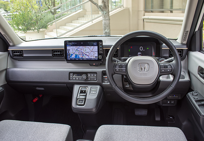 美点は、より自然な運転姿勢が取れるよう、N-ONE比でステアリングを37mmドライバーに近づけたこと。また、フロントフード形状の工夫で運転席からの視界が向上し、前走車との間隔がつかみやすくなっている。