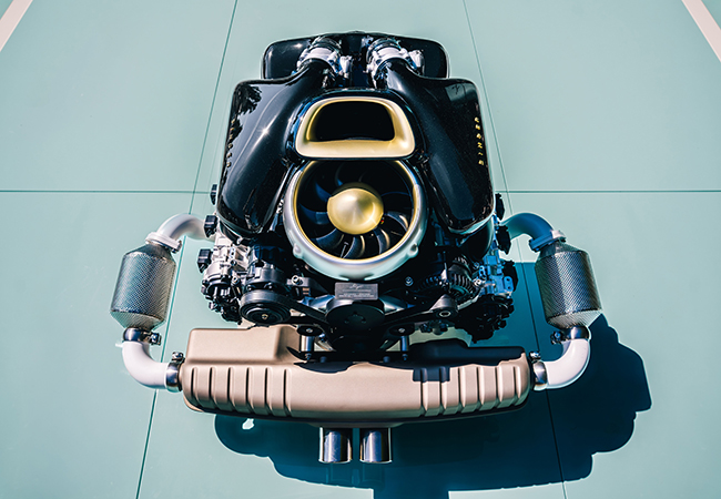 Porsche911 Carrera Coupe Reimagined by Singerの詳細を見ていこう。エンジンは4リッターフラット6を搭載する。1気筒あたり4バルブで、可変バルブタイミング、水冷シリンダーヘッド、空冷シリンダー、電動ファンを備えて生まれ変わった。このエンジンの設計・開発はコスワース(Cosworth)との共同プロジェクトであり、可変バルブタイミングや燃焼室の設計、吸排気経路の最適化といった分野で彼らの経験が活かされている。結果、最高出力は420psというから恐れ入る。しかも、8000rpm超の高回転を許容する。そもそも当時の自然吸気ユニットは高回転型ではないのはご承知のとおりである。ギアボックスは6速MT。新開発のチタン製エキゾーストシステムが、フラットシックス本来の伸びやかな吹き上がりとシンガーらしい官能的なサウンドを提供してくれるそうだ。