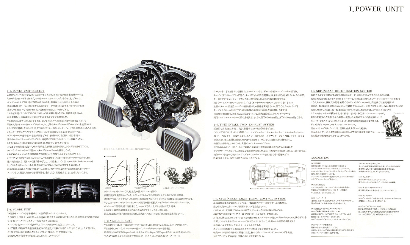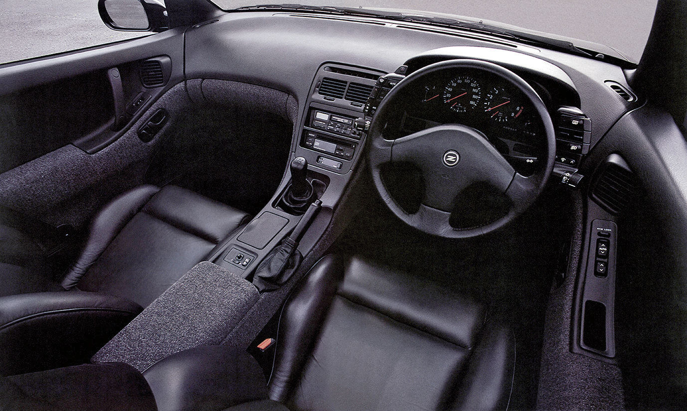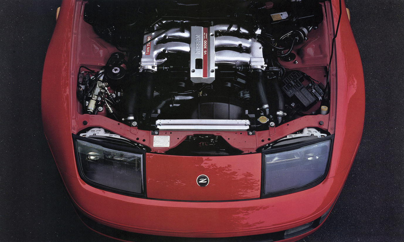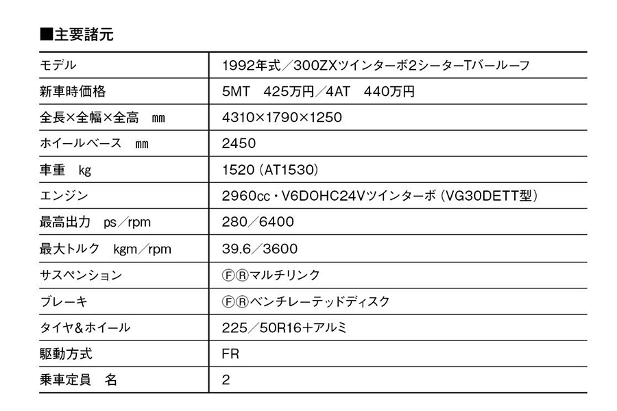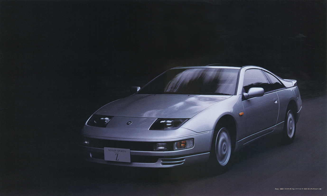 日産フェアレディ300ZXツインターボ(Z32型)。Z32型は1989年2月の北米シカゴ・ショーでワールドデビュー。同年7月に日本仕様を発表し「スポーツカーに乗ろうと思う」のキャッチコピーで人気を集めた。カタログでは「開発基本テーマは[1990年代をリードする新世代の本格スポーツカーを作ること”であった]と宣言。ラインアップは2シーターと2by2の2シリーズ。それぞれにツインターボ(280㎰/39.6㎏m)と自然吸気(230㎰/27.8㎏m)を設定した。足回りは4輪マルチリンク式、全車が脱着可能なガラスルーフを備えたTバールーフ仕様(一部グレードに未装着車も設定)だった