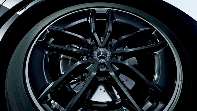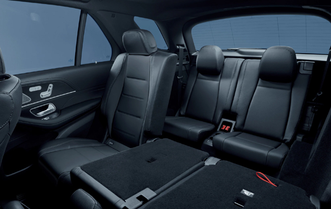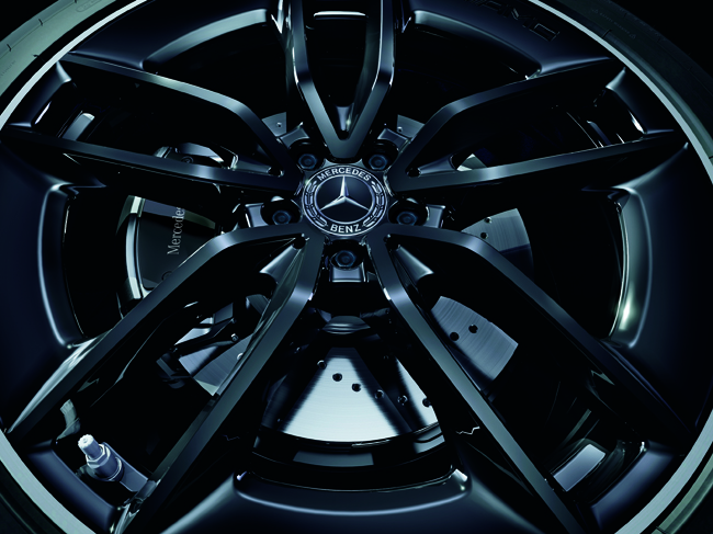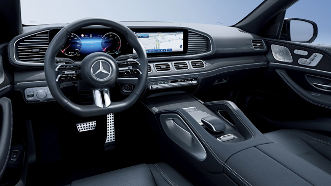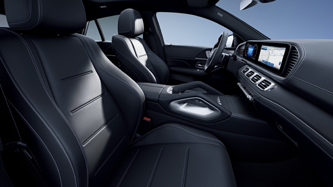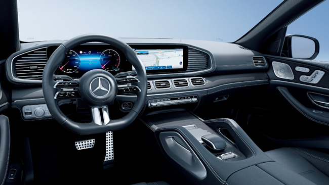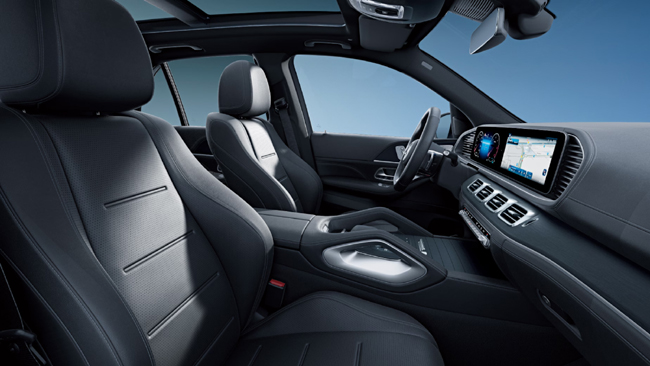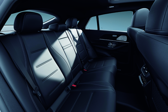 まずエクステリアは、ナイトパッケージの導入によりドアミラー、ルーフレール(GLE)、フロントリップ、リアバンパーをブラックで仕上げ、合わせてドアハンドル上部にはダーククロームを配して、いっそう精悍なスタイリングを創出。シューズにはブラック基調の22インチAMGアルミホイール(RPJ)を組み込んで、足もとの存在感を高めた。