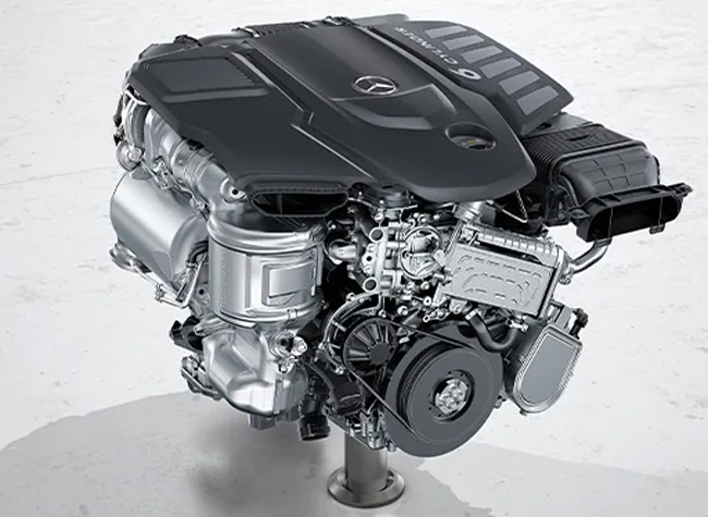 パワートレインは既存の450d 4MATICを踏襲し、“656M”2988cc直列6気筒DOHCコモンレール式直噴ディーゼルターボエンジン(最高出力367ps/4000rpm、最大トルク750Nm/1350~2800rpm)+ISG(インテグレーテッド・スターター・ジェネレーター、モーター出力15kW/200Nm)/48V電気システム/リチウムイオンバッテリー(容量約1kWh)+9G-TRONIC(電子制御9速AT)を搭載し、駆動機構には前後の連続可変トルク配分を行う4WDシステムの4MATICを採用。また、懸架機構にはAIRMATICサスペンションとアダプティブダンピングシステムを標準で組み込み、さらに走行安定性と快適性を高めるE-ACTIVE BODY CONTROLパッケージをオプションで選択可能としている。