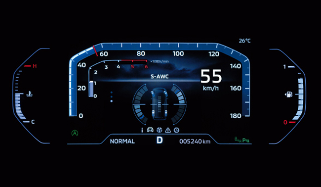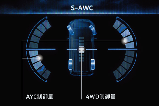 ▲三菱自動車独自の車両運動統合制御システム「S-AWC」を採用。作動は1:ドライバーの操作と車両状態をセンサーで検知して前後の駆動力配分とブレーキ制御量を決定、2:ブレーキを制御するAYCとASC、ABSを統合して左右輪間の駆動/制動力を制御、3:電子制御4WDが前後輪へ駆動力を最適配分、4:安定した走行性能とリニアなハンドリングを実現