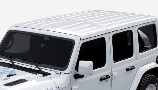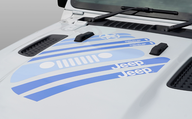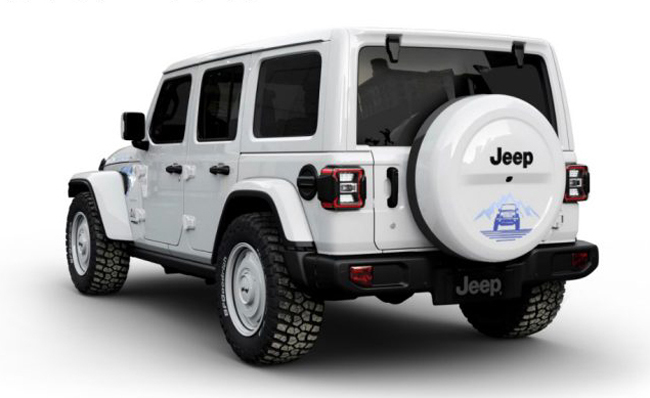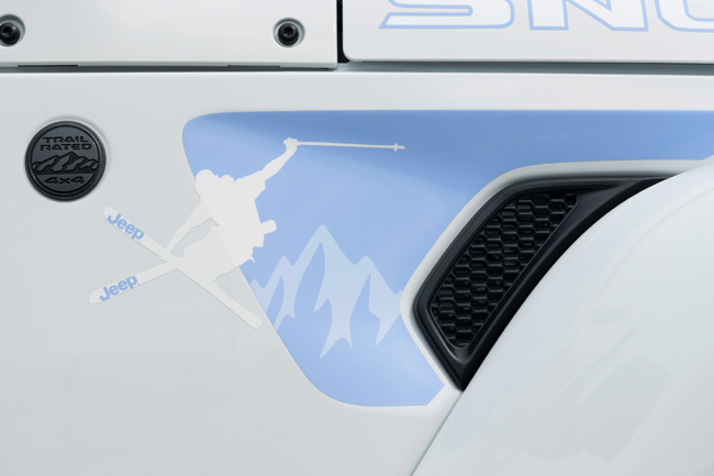 まずボディカラーには、鮮やかな白色のブライトホワイトC/Cを採用。ここに米国のプロダクトデザインチームと共同で制作した、スキーとスノーボードをモチーフとする専用デカールをフロントフードと左右フロントフェンダーに特別装備する。また、リアにはWranglerイラスト入りホワイトハードタイプスペアタイヤカバーを、左リアガラスにはジープの原点ともいえるWillys MB(ウィリス エムビー)とイエティ(雪男)が並んで歩くデカールを配備。さらに、Jeepロゴ入りのホワイトドアミラーキャップやボディ同色フリーダムトップ3ピースモジュラーハードトップも採用する。そして、足もとには印象の異なる2通りのスタイルを楽しむことができる専用2ウェイ18インチアルミホイールを装着。ホイールデザインの1つはWillys MBのスピリットを受け継ぐコンセプトカー「Willys ’41(ウィリス フォーティーワン)」から着想を得たクラシカルな佇まいで仕上げ、もう1つはシルバーの大型キャップで覆って力強い存在感を放つ。いずれもセンターキャップにはWillys MBのシルエットを刻印した。