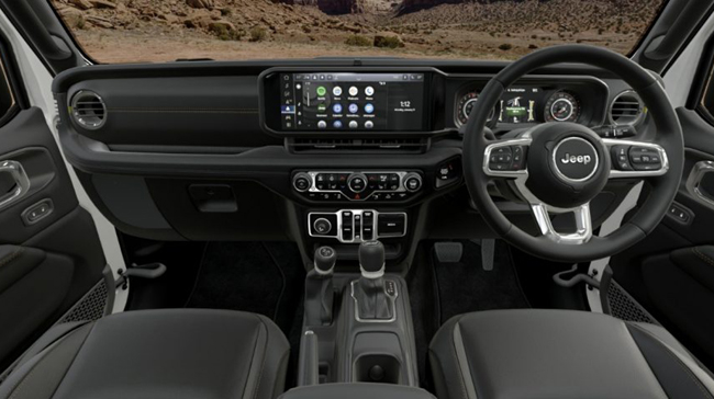 インテリアはベース車と同様にブラック基調でアレンジ。装備面ではフルカラー7インチマルチビューディスプレイやテクノレザーステアリングホイール、革巻きシフトノブ、12.3インチタッチパネルモニター付オーディオナビゲーションシステム(Uconnect)、サブウーハー付アルパイン製プレミアムスピーカー(9基)、フロント&リアドームオーバーヘッドLEDランプ、Mopar製ハードトップヘッドライナー、プレミマムマッキンリーシート(合成皮革)、フロントシートヒーターなどを標準で組み込んでいる。